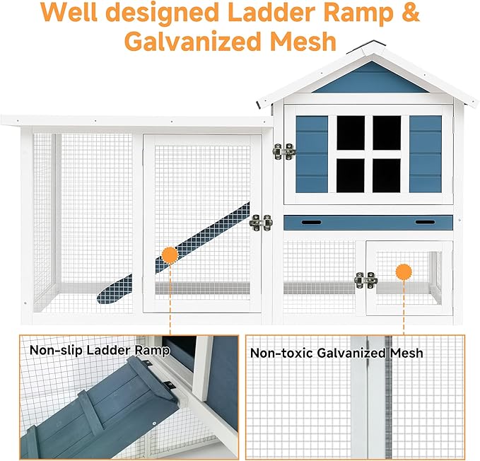 - Dual-Living Indoor/Outdoor Haven, Perfect as a chic indoor bunny condo or a backyard chicken coop! The widened anti-slip ramp, 2-story design, and 4 access doors (front/side/roof/ramp) let pets climb, play, and rest, while you bond through multiple interaction points. Fits apartments and gardens alike