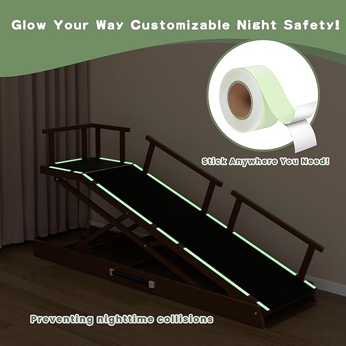 - 🛡️ Triple Safety System Seamless removable guardrails (3 side panels) prevent falls, paired with Anti-Slip Anchor Straps to secure ramp base. Includes DIY glow strips for enhanced nighttime visibility and safety.