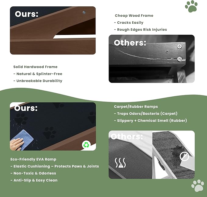 - 🐾 EVA Non-Slip Dog Ramp Surface Upgraded EVA mat offers superior traction, odor-free cushioning for paws, and gentle joint support. Easier to clean than rubber or carpet competitors.