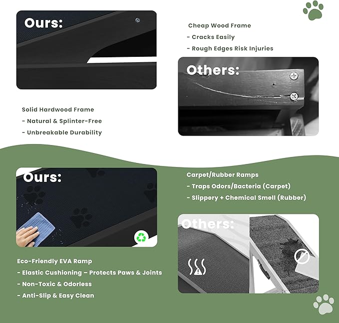 - 🐾 EVA Non-Slip Dog Ramp Surface Upgraded EVA mat offers superior traction, odor-free cushioning for paws, and gentle joint support. Easier to clean than rubber or carpet competitors.