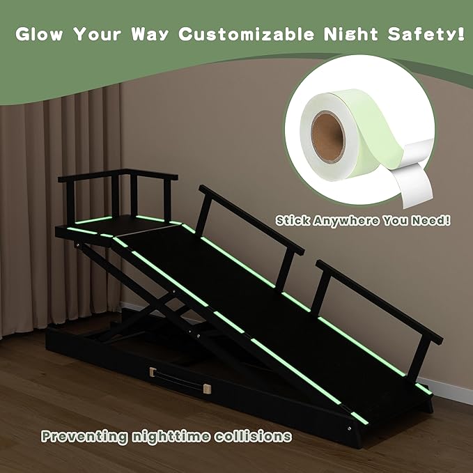 - 🛡️ Triple Safety System Seamless removable guardrails (3 side panels) prevent falls, paired with Anti-Slip Anchor Straps to secure ramp base. Includes DIY glow strips for enhanced nighttime visibility and safety.