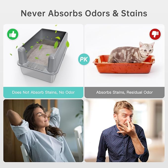 - 【Why Choose Stainless Steel Litter Box!】 Open top stainless steel cat litter box made of high-quality ABS enclosed high wall enclosure and stainless steel litter pan, unlike plastic litter boxes, stainless steel litter boxes with high sides do not collect any residue or odor, are easily to clean, have strong and durable, and never rusty