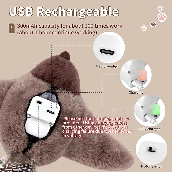 - Rechargeable: Rechargeable flapping bird cat toy has long-lasting life, comes with a charging cable, no need to repurchase frequently, you can enjoy continuous fun with your boys and girls. It's also Easy to remove and wash. Battery capacity for about 200 times work(about 1 hour continue working)