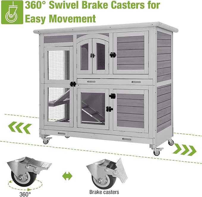 - Mobile Rabbit Hutch with Secure Casters: Four smooth-rolling casters allow easy relocation of the bunny hutch, with two lockable brakes ensuring stability and safety on any surface.