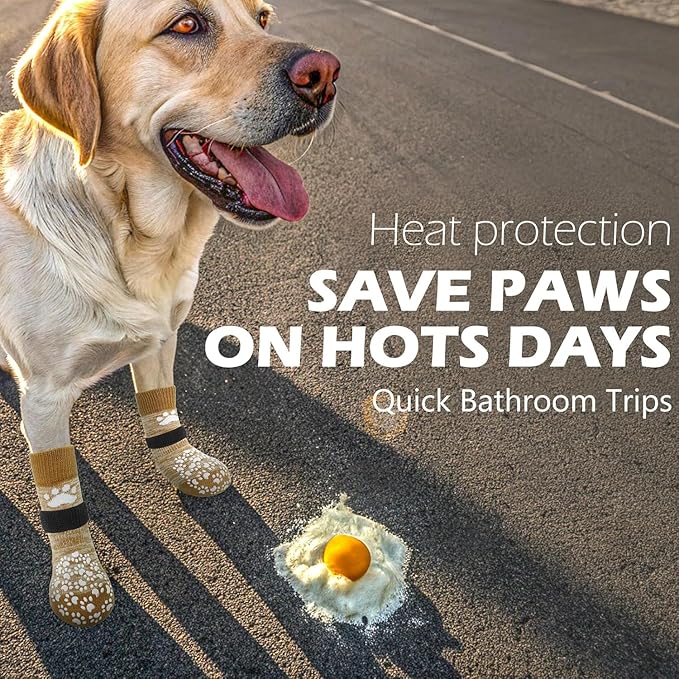 - [Premium Material] Made of elastic and comfortable breathable knit fabric, It's soft and light, so dogs will easier to accept it, The durable bottom with extra-thick grip is specially crafted to shield your furry companion's paws from the hot and cold pavement, and rough outdoor surfaces. these socks create a protective barrier between your dog's paw pads and the ground, guarding against extreme temperatures and rugged terrain.