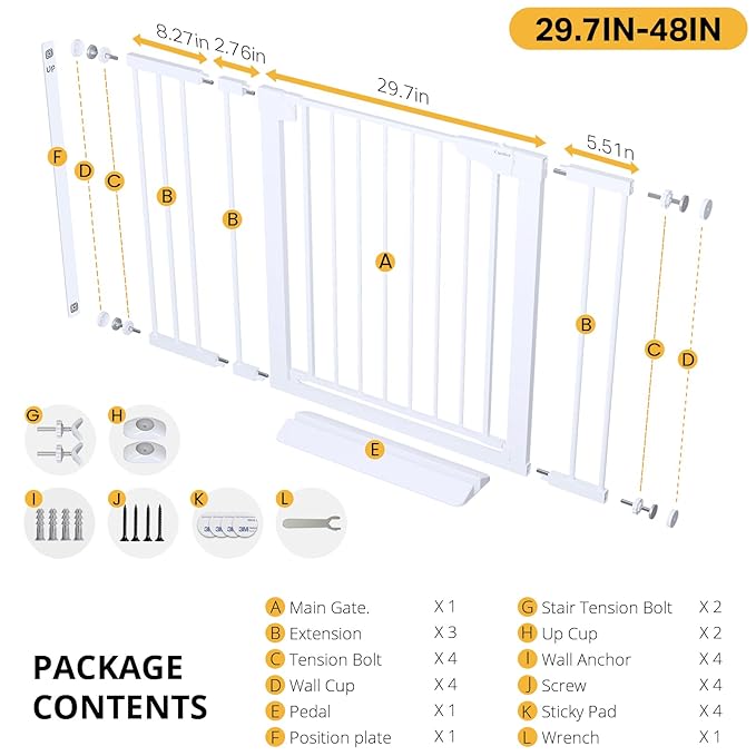 - Extra Wide Walk-Through for Easy Access: Fits openings from 29.7" to 48" wide and stands 30.5" tall. The 23.6-inch walk-through door provides more clearance than standard gates—allowing adults to pass through easily, even when holding a baby or carrying items.