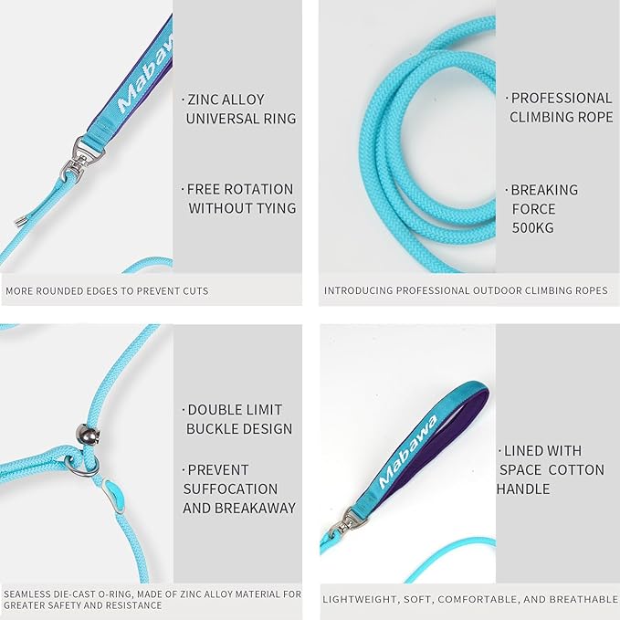- 【Double Limit Design】: Heavy duty rope dog leash has 2 metal stoppers, which are anti-suffocation and anti-escape, and can easily stop the dog from pulling and will not cause harm to the dog. No-pull training, correcting bad behavior and controlling it in a short period of time, this chew proof leashes for dogs is effective for most dogs.
