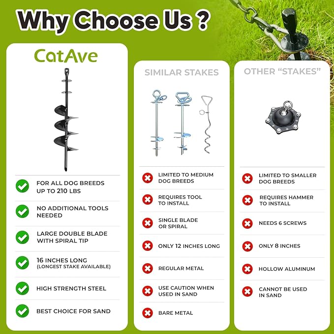 - KEEP YOUR DOG SAFE & HAPPY – No more worries about your strong pup breaking free! Our heavy-duty dog stake is built to hold back even the largest breeds (up to 210 lbs) so your furry friend can enjoy freedom outdoors—while staying safe. (No leash included—works with any standard tie-out cable or leash.)