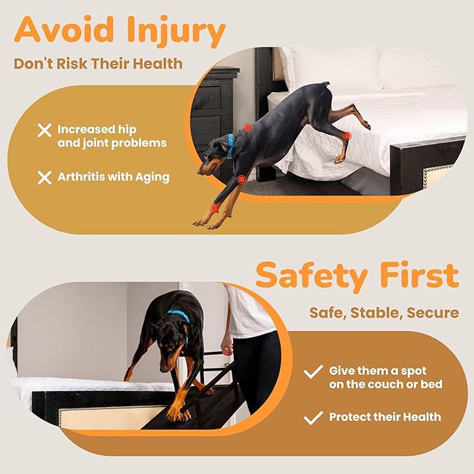 - DURABLE & STURDY: Our pet ramp for dogs and cats is specially made very well - solid wood construction and sturdy stainless steel fasteners, which has been tested to support up to 200lbs. When they jump off the bed, sofa, and sofa, there is no need to worry about getting injured, which provides safety for your pet.