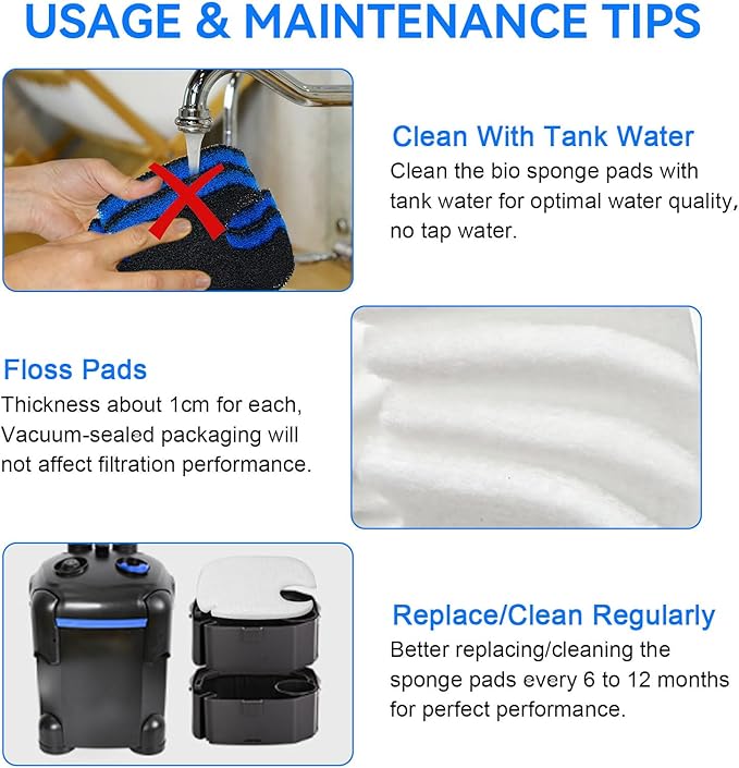 - Tips for Maintenance:βResine the bio sponge pads with tank water for optimal water quality, do not use tap water.βReplace or rinse sponge pads every 6 to 12 months for optimal performanceβBetter replace the white polishing pad every 2 to 6 weeks.
