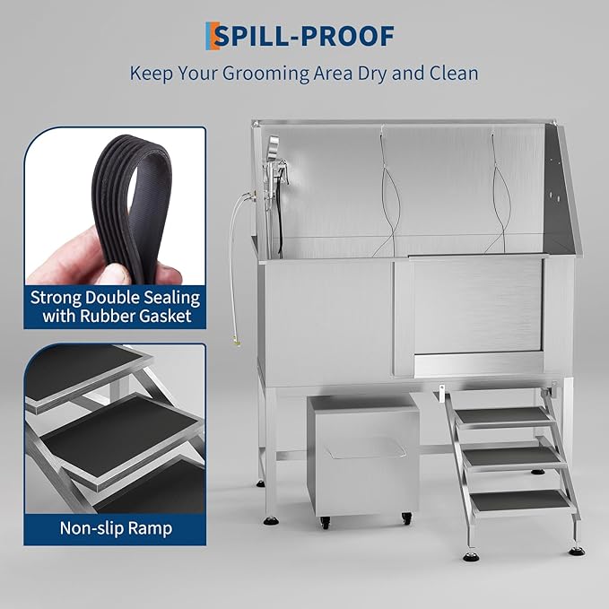 - Safety-Equipped Wash Tub Includes non-slip access ramp, storage cabinet, and locking gate mechanism to secure pets during bathing procedures.